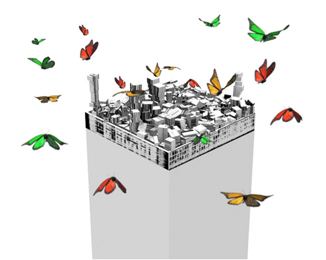 The city is a container and transformer, autonomous and explosive. It makes demands and keeps promises, uses power to expand or dismantle possibilities. The very pressure of its limited space produces more social collisions and interactions within a generation than would have occurred in many centuries if not for this force. Cities attract people, ideas and lines of social energy. They are composed of dynamics that rise, decompose and reconstruct by way of ingenuity and human toil. In a way, we can understand the creation of the metropolis as the marriage of technology and human spirit, an amalgamation of the mundane and the extraordinary, or as an expression of potential. While computers serve as "efficient" storage centers for knowledge and the Internet has created a virtual interlocking community, the relationship between technology and culture has proved to be far more complex than deterministic. These interrelated components together form a system that exhibits properties and behaviors not palpable from its individual parts. The city's transformations and shifts are at once subtle and drastic. In this project this concept is expressed as the flapping of the wings of the butterfly, an insect uniquely capable of making a trans-Atlantic crossing. A visual gamut of natural and technological splendors and failures are thus phrased as a testament of shifting dynamics, eternal return, interconnectivity and beauty. Urban Butterflies Undique forms part of Amir Baradaran's ongoing body of work, FutARism.