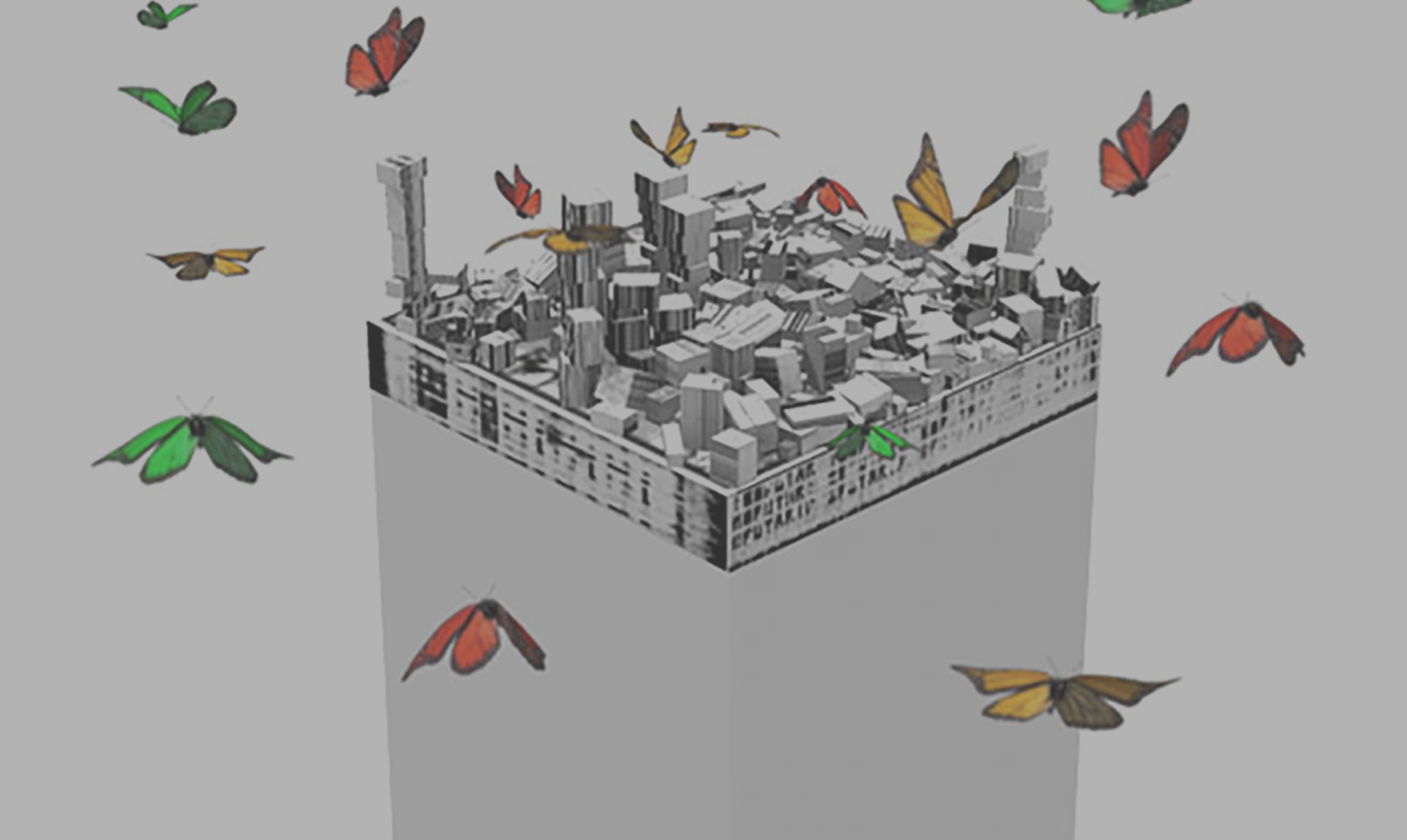 This project invites participants to observe themselves as reflected in a wall mounted Augmented Reality LCD screen "mirror." Motion sensing equipment reads the spectator's body gestures and a 2D AR marker placed on a plexi-glass pedestal in front of the screen trigger the materialization of a 3D cityscape that will arise and crumble, releasing a migration of butterflies. The participant will find himself or herself located within this scenario, directly influencing the course of events through the power of their presence, observation and body motion.