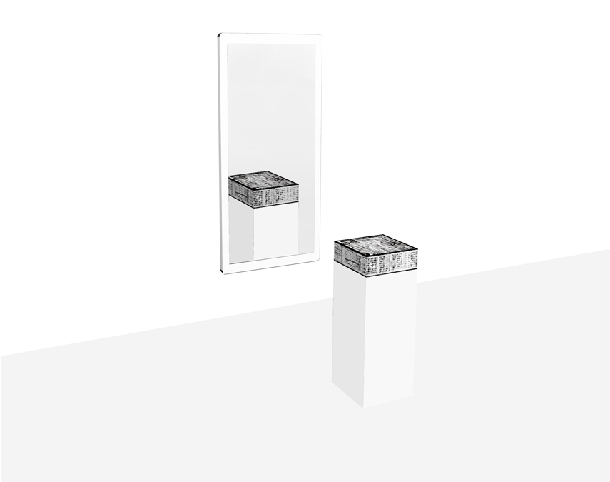 An Augmented Reality (AR) Installation. Custom designed computer 12"x12"x6". Wall mounted LCD screen 36"x60"x6". Fluid dynamic algorithms, motion sensing input device, camera. White plexi-glass pedestals 15"x15"x30". Custom designed AR Marker.