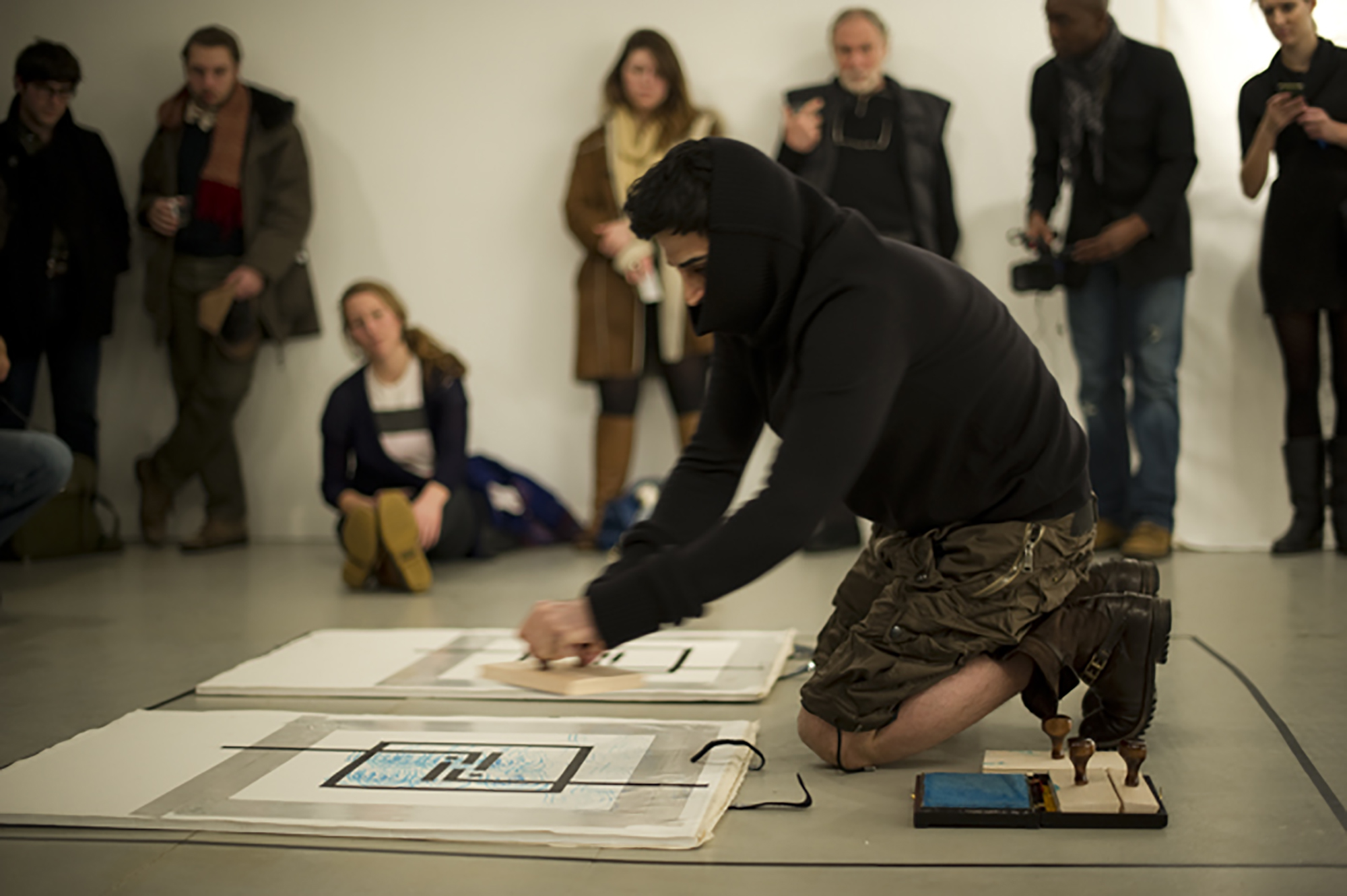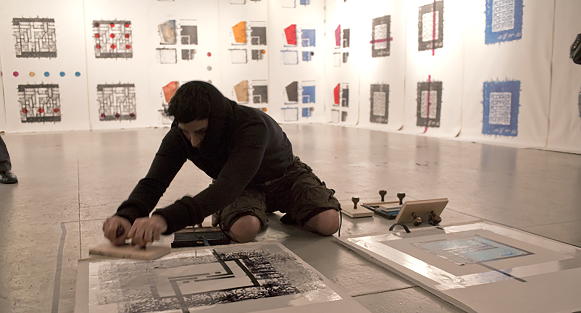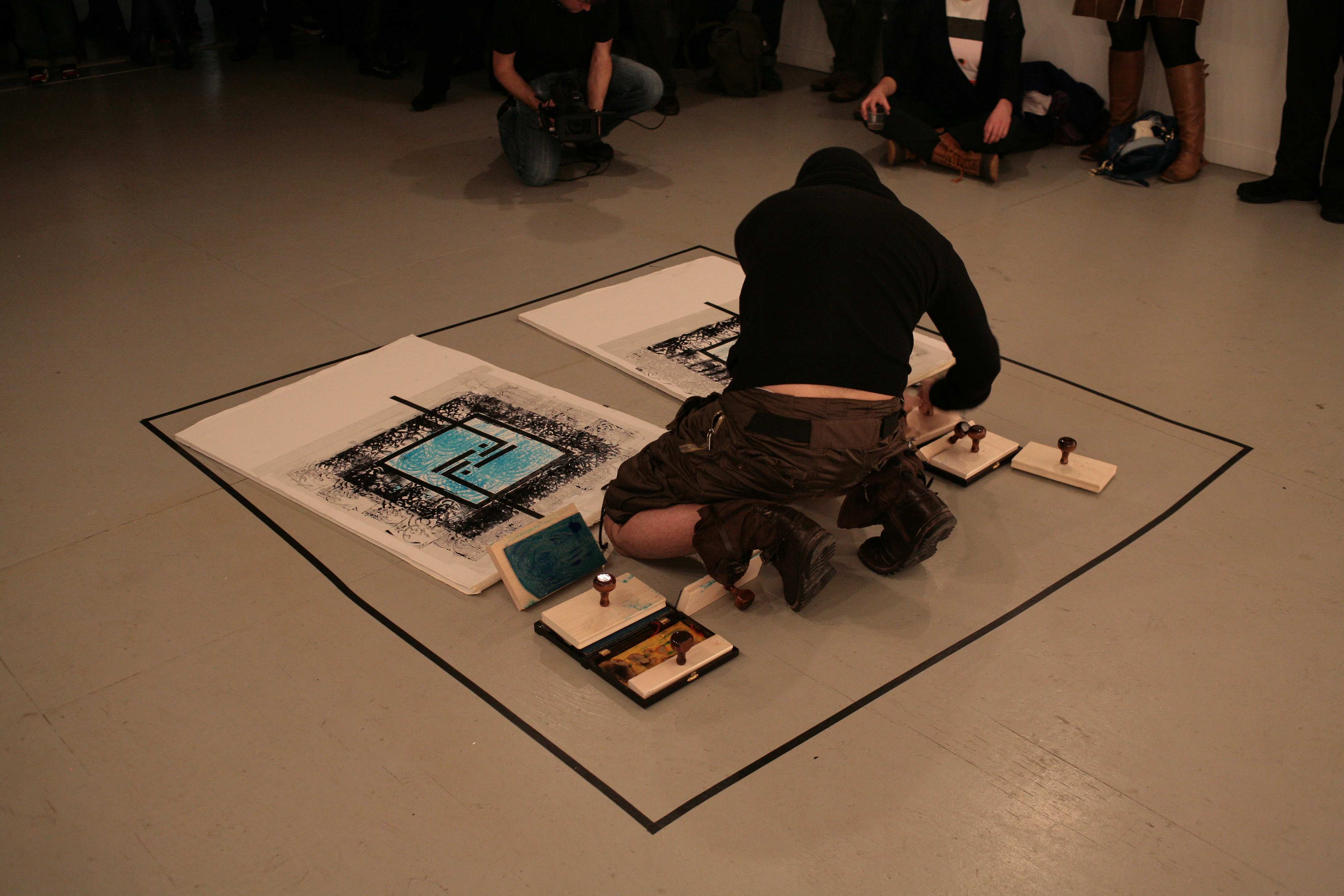 Like other forms of mark making, calligraphy is wrapped up in the metaphysics of bodily presence. Here, the trace of the body digital is presenced in the performativity of calligraphy. The repeated act of stamping the calligraphy onto the sandwich board (an old-fashioned spectacle) creates the marker. Generative knowledge and ancient tradition are literalized and embodied in this process, compelled by desire and necessity (like a child beseeching, "again, again, again," or Freud's fort/da). Singing - air pushed over a muscle, interiority made exteriority made interiority - reinforces this productive trance, the multilayered imbrications of this new flesh. More, chanting Sufi poetry creates a center from which the slide into pure spectacle is evaded. The stamps builds up and makes semi-opaque the surface of the board, a palimpsest of hope.