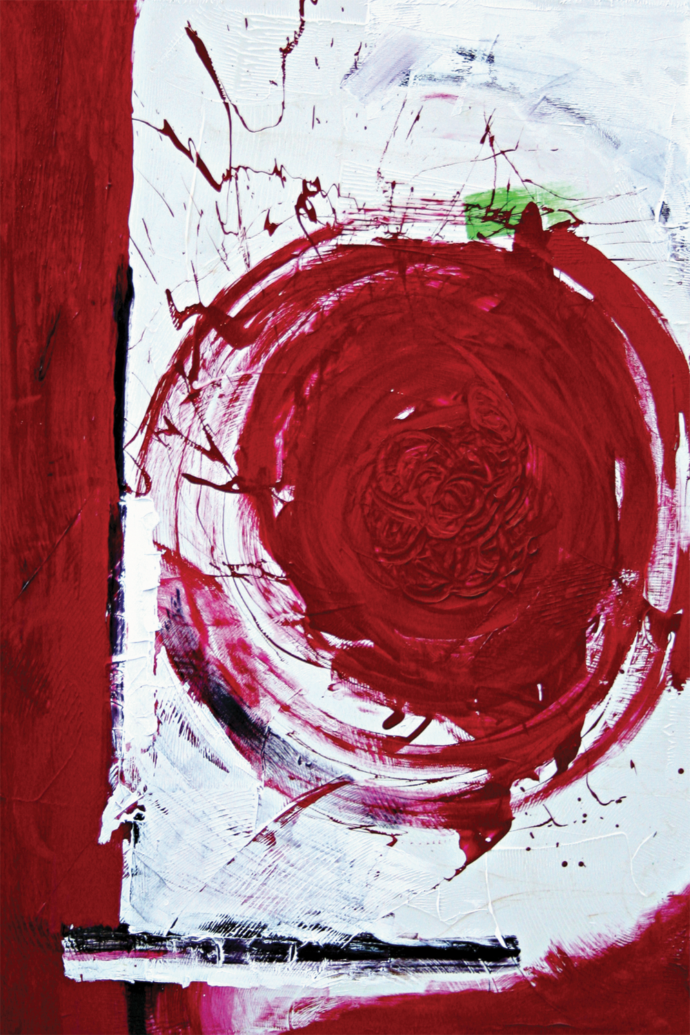 A palpable shift towards the past is the driving force behind this second series. In it, Baradaran pays homage to 1950s-70s Iranian avant-garde artists such as filmmaker Taghvai and, more notably, the painter, Kalantari. This panel, which also included influential poets and painters, aspired to breakdown the boundaries of modernity and indulged in portraying the many splendors of their tradition. Inspired by this philosophy, Baradaran is inviting the viewer to acknowledge the vitality of these artists’ works through his own paintings. Amir consciously creates a visual return to the center and, in great part, to spirituality. The celebratory state ascribed to the so-called modernist wave is no longer a mere hint; it has now taken a more prominent shape through the unremitting use of the word “Hé” for “Hastam” (I exist), written in Persian calligraphy. As an art form, the calligraphy of the word “Hé” in the shape of two intertwined circles, is beautifully incorporated within the prevalent circular forms themselves. The artist incorporates rosary beads as a final testament to the ever-changing self. The wave that hits the shore and retreats is parallel