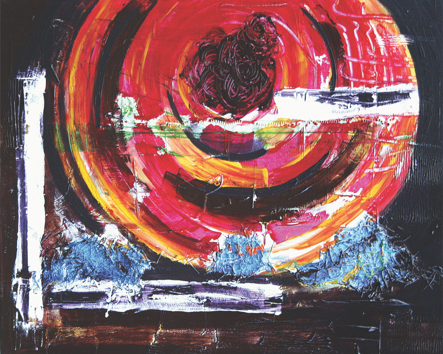 In the simplest of ways, Iqbal Lahoori has exposed the tumultuous relationship between two opposites: a shore that is still and stagnant in nature, and a wave that is in constant motion, ever-changing. The taunting words of the wave, “Standing still means inexistence; I’m in movement. Yes! I am” exhibit an overpowering presence and animosity towards the shore’s immobility. This dialogue is subscribed within a modernist worldview between past and present, tradition and modernity. The artist scratches the surface of this dichotomy with the tip of his brush, slowly inviting the viewer to not only consider, but perhaps indulge in the possibility that vibrancy lies outside of ideals of modernity. In doing so, Amir unapologetically confronts the very question that this literary piece inspires: Can there be life without movement? The artist utilizes disruption of linearity and points of constraint in juxtaposition with free-hand circular strokes in order to demonstrate the literal conflict between the two contrasting entities.
