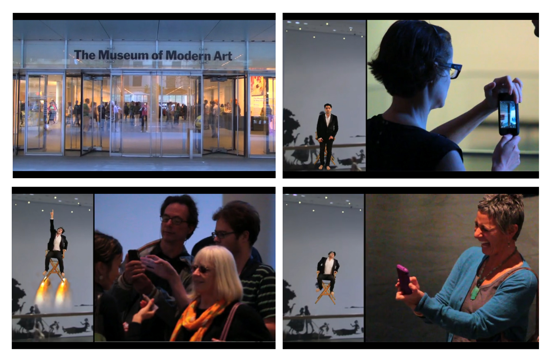 Takeoff by Amir Baradaran is a part of WeARinMoMA (2010), the first international Augmented Reality (AR) exhibition, permanently installed in The Museum of Modern Art. AR adds virtual content to a given space, experienced in real-time and in semantic context with the real-world environment. In this instance, that content is identified via global positioning systems and is viewable with the smartphone application Layar. On the screen of their phone, visitors to the museum engage with Baradaran's work: a video of the artist "taking off" in a director's chair before crashing back down to earth.