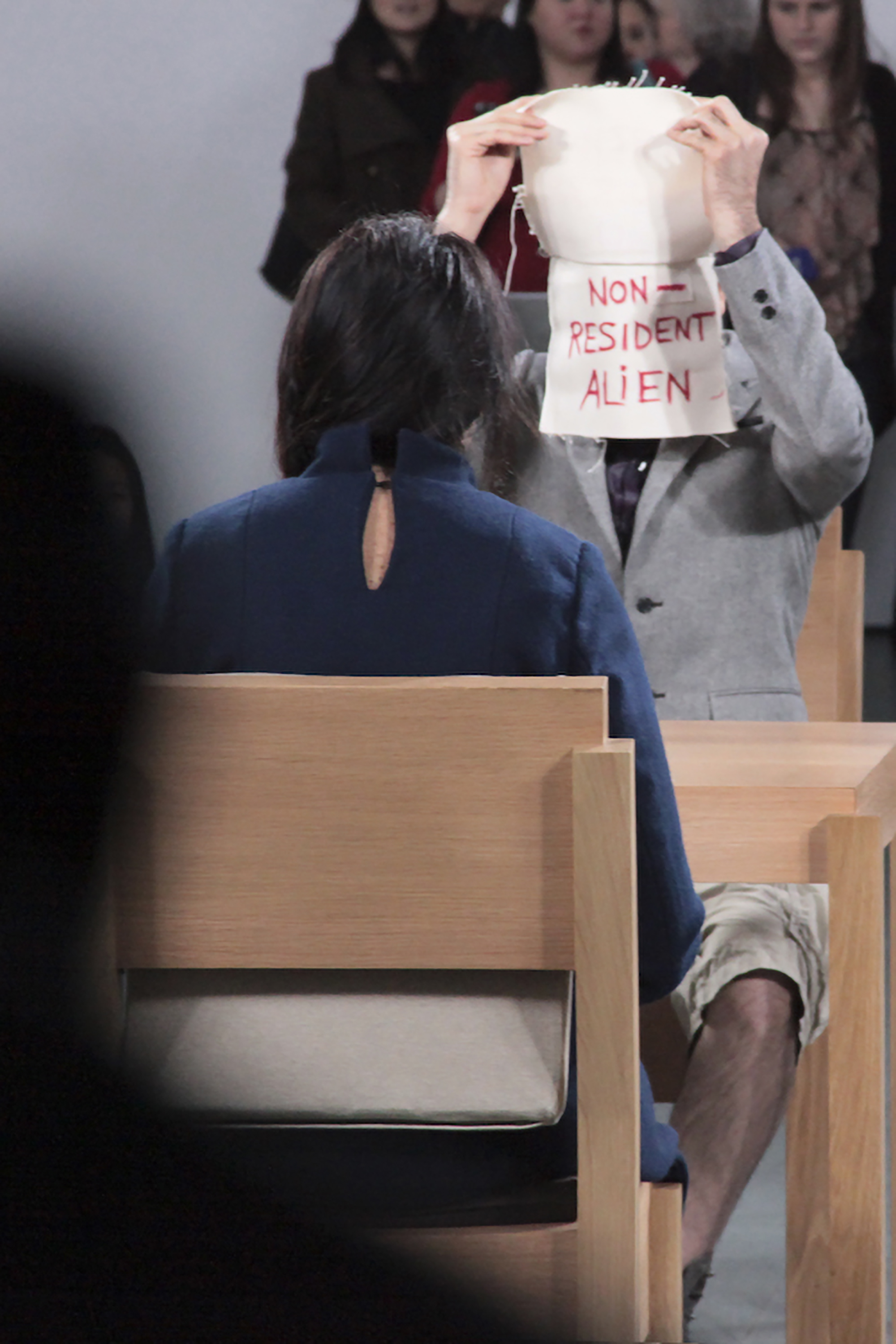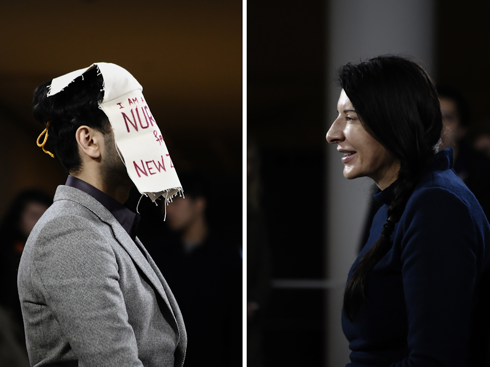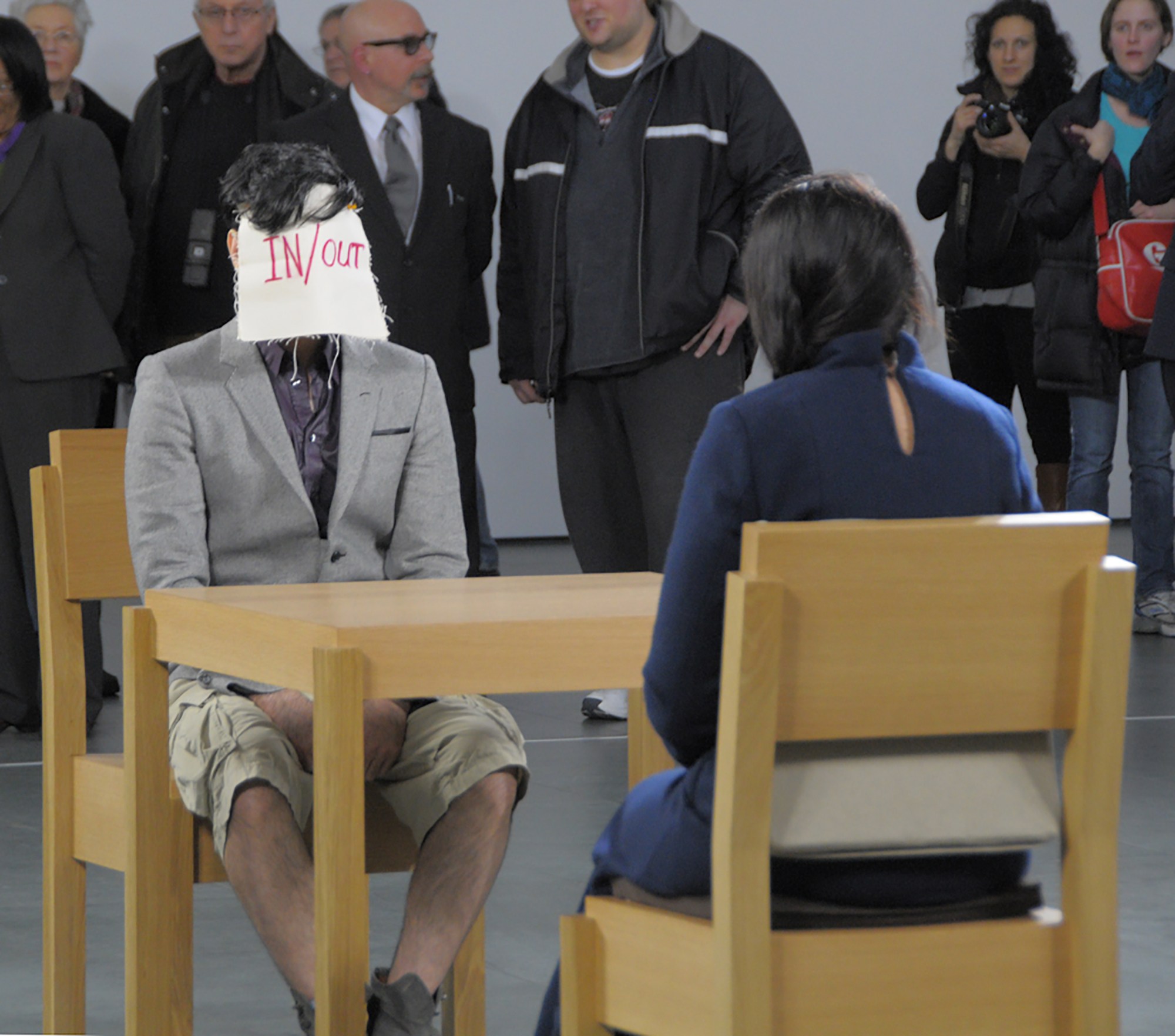 I return to the table with my face now concealed by a series of four overlapping canvases. Each is emblazoned with an enigmatic message. The first canvas, "In/out," sets the tone as it refers to borders. The second, "I am a nurse from New Zealand" appears to break Abramovic's concentration for a moment, moved as she recognizes the reference to an alias she dons when traveling. Unaware of the effect I have had on Abramovic, I reveal the next canvas: "a non resident alien" – a status familiar to both of us. The final layer, "passing of the author," references Roland Barthes' essay, The Death of the Author, a text that advocates the separation of the artist from his or her artistic creation. I want my infiltration to make the audience question: Who is the performer? Who is in? And who is out?