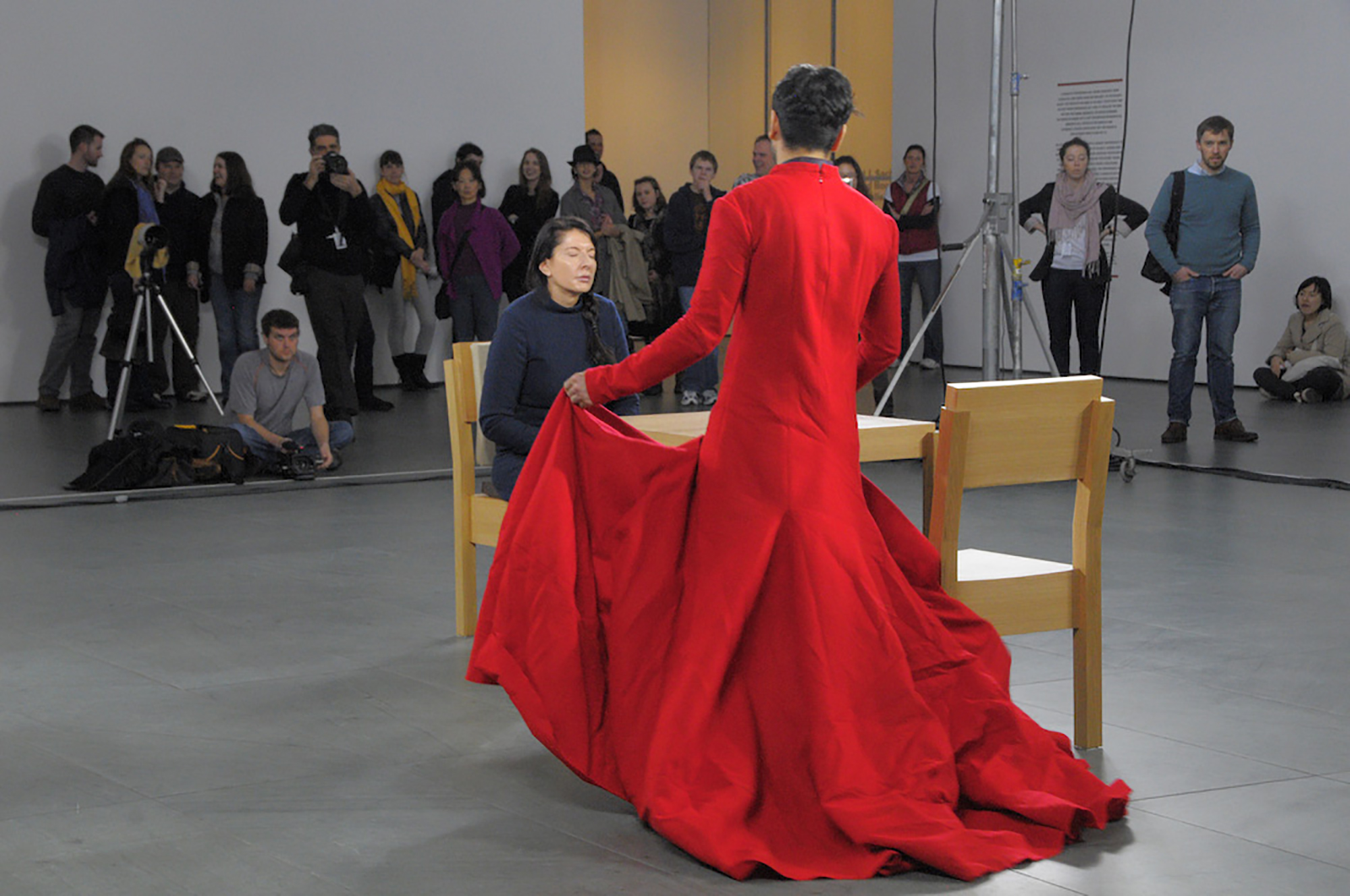 As I enter the meditative space in a flowing red gown—a close facsimile to Abramovic's deep blue robe—I add symmetry to the scene. Out of earshot of the audience, I expresses my deep and sincere devotion to Abramovic's artistic legacy: "I love your bodies of work… and I would love to be wedded to this body.... do you accept this marriage, here and now??"